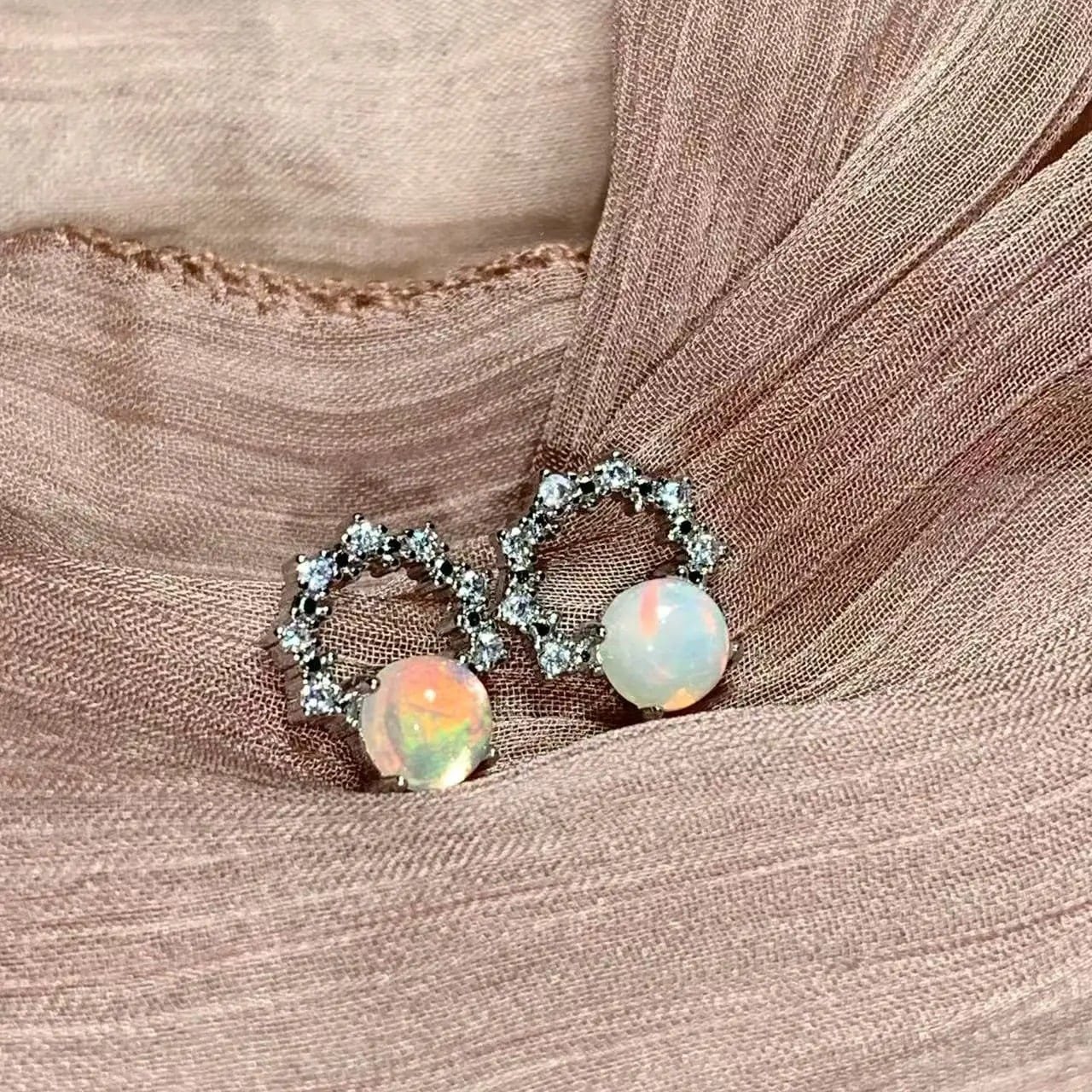 Le contour délicatement serti de petites pierres scintillantes crée un contraste raffiné entre brillance céleste et éclat minéral. L’ensemble confère à ces boucles d’oreilles un caractère singulier : à la fois aérien et intensément présent. Leur design circulaire évoque le cycle lunaire, symbole de renouveau et de force tranquille.